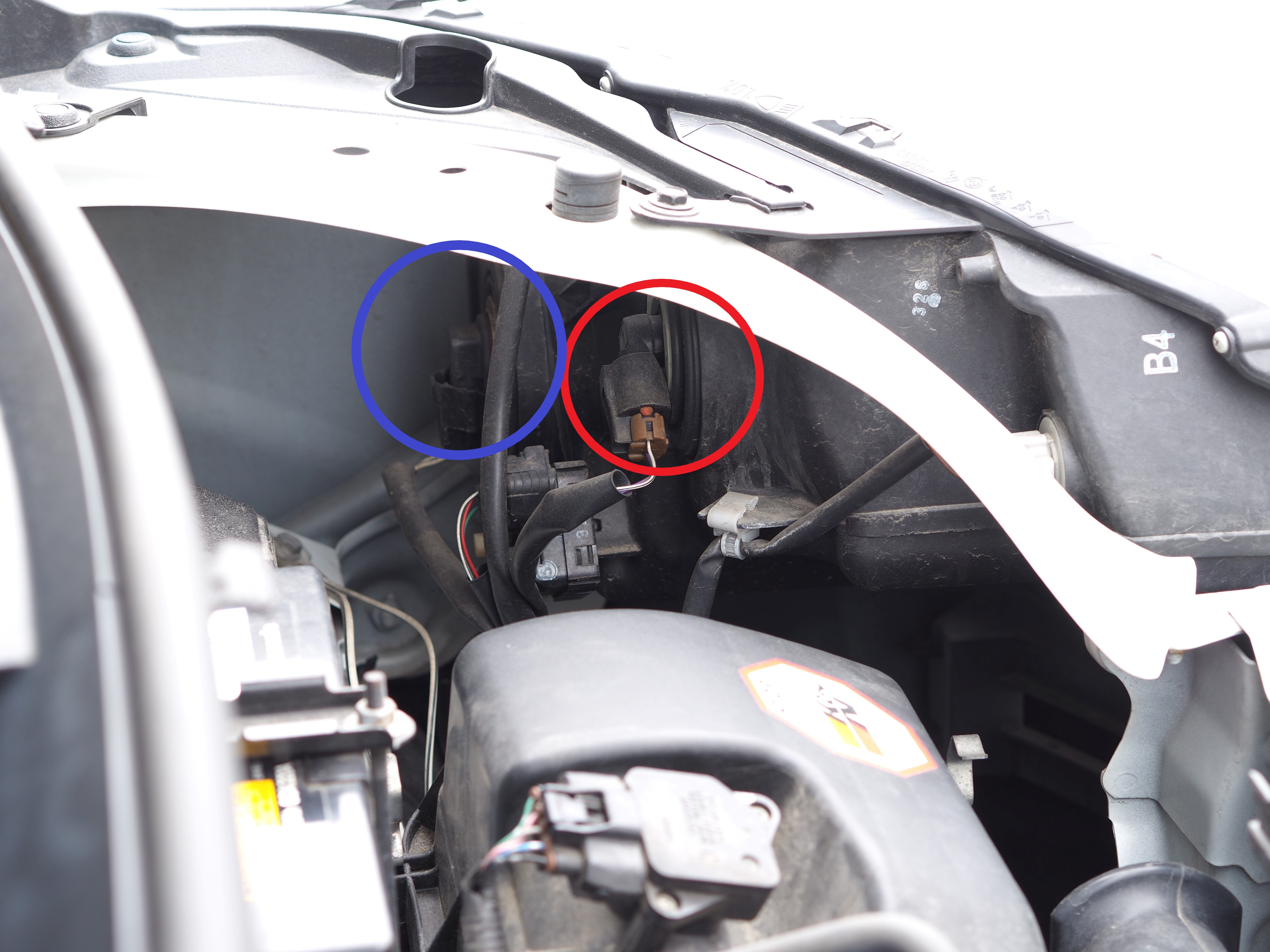 んで、赤丸がハイビームの場所で、青丸がロービームの場所。
